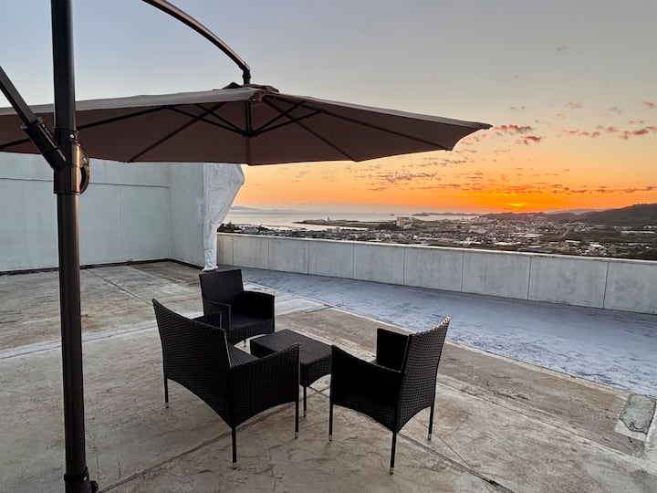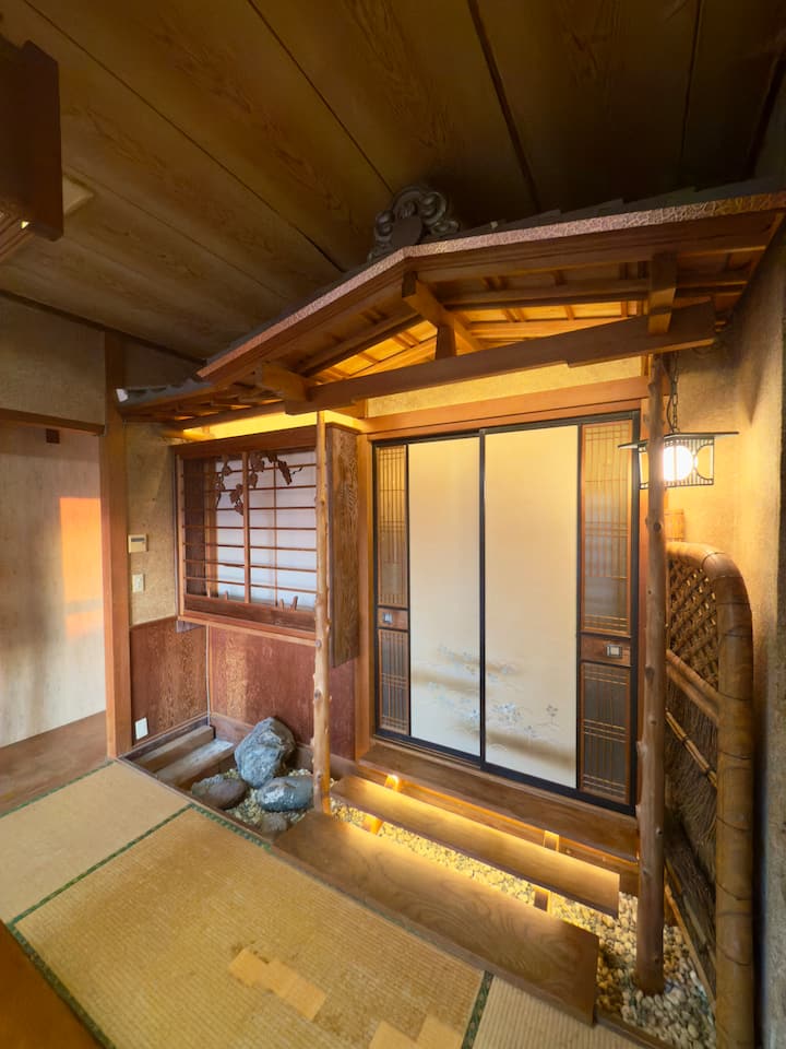 瓦屋根の神社スタイル |オーシャンビュー|石庭の川に架かる木橋を渡るロマンチックな寝室
