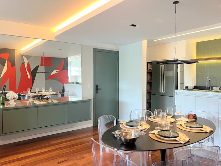 При влизане в апартамента ще бъдете посрещнати от уютна трапезария с красива артистична интервенция, интегрирана с кухнята и всекидневната.