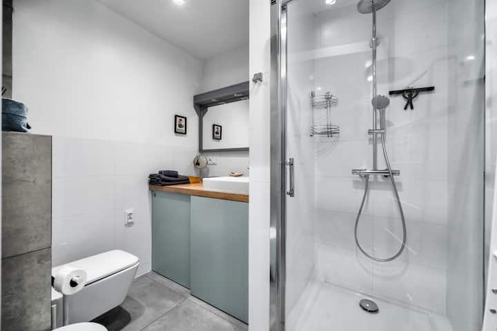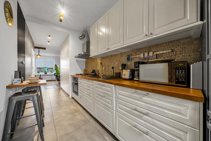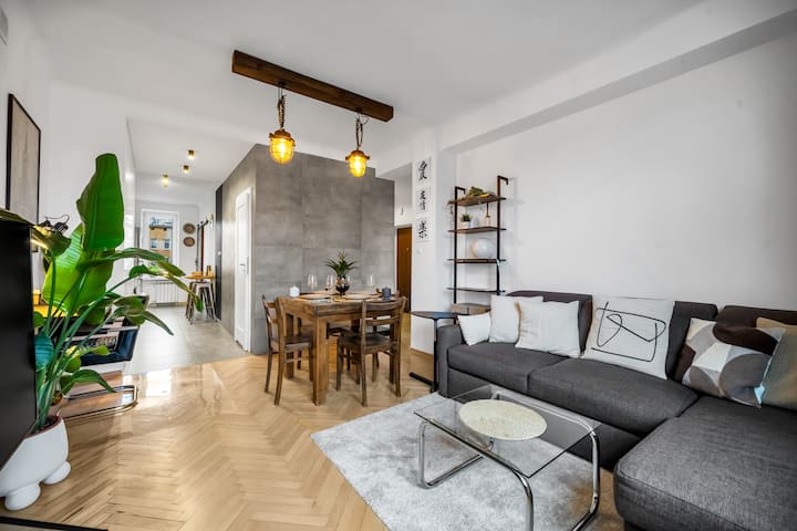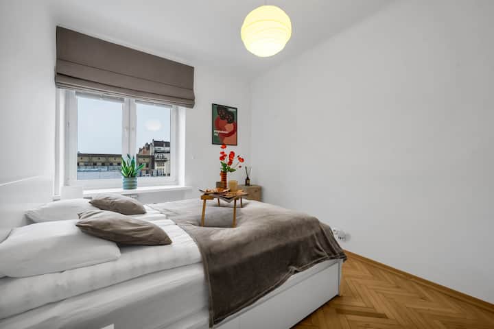 Апартаментът е внимателно проектиран за настаняване на до четирима гости, с уютна спалня с двойно легло и просторна всекидневна с удобен разтегателен диван. Големи прозорци пропускат много естествена светлина, което ви дава зашеметяваща гледка към града, която перфектно улавя енергията на центъра на Варшава.