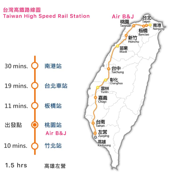 - 從桃園高鐵站到台灣各地:從桃園高鐵站到臺北車站18分鐘,到高雄左營站1個半小時。