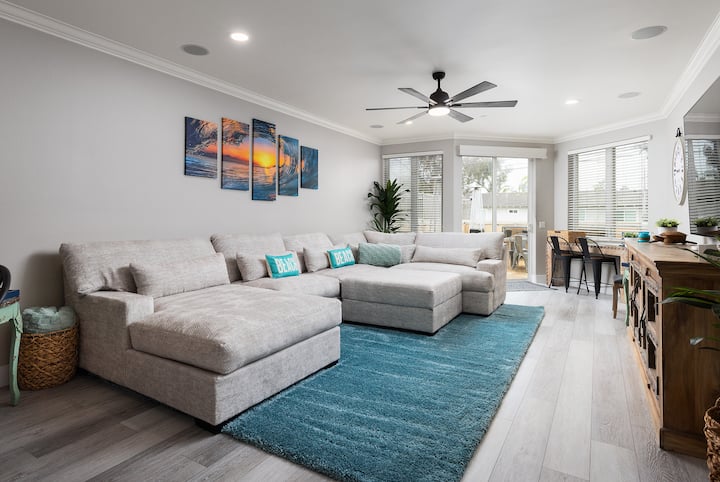 Домът ни е светъл и просторен с забавна крайбрежна естетика. Паркирайте в нашия гараж за 2 коли и се насладете на крайбрежен начин на живот ~ разходете се до селото за пазаруване, хранене и забавление или просто се отпуснете на плажа само на 1 пресечка. И все пак на кратко разстояние с кола ще се насладите и на голф игрища, известни цветни полета, пистата и панаира на Дел Мар, Леголенд, зоопарка в Сан Диего и други. Това е най - добрата ви кратка почивка в Карлсбад!