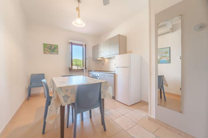 Всички апартаменти се обслужват от климатик във всяка стая. Разполагат с модерна кухня, оборудвана с индукционни котлони и електрическа фурна. Този двустаен апартамент се намира на първия етаж, влизате в апартамента и виждате банята с прозорец, душ кабина, биде и стенен сешоар вляво. Всекидневна с двойно разтегателно легло и единично легло. Спалня с двойно легло, прозорец и вентилатори на тавана.