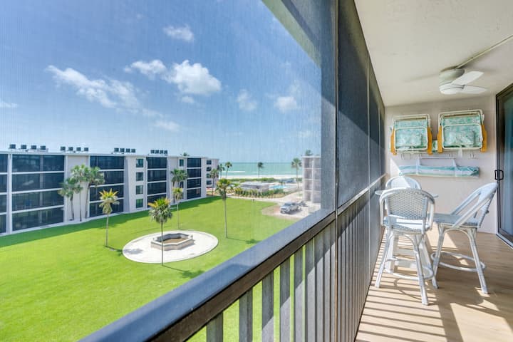 На плажа с изглед към океана на последния етаж! Насладете се на искряща гледка към океана от това релаксиращо крайбрежно убежище, само на няколко крачки от плажа. Този голям апартамент е с 4 места и е напълно реновиран, за да включва разширена персонализирана кухня и луксозна баня с голям душ. Най - доброто крайбрежно обзавеждане във всяка стая. Просторната родителска спалня предлага изглед към залива, голямо двойно легло и пълноразмерно бюро, ако имате нужда от тихо пространство за работа. Wi - Fi е напълно подобрен, за да направи поточното предаване и видео клиповете лесни.