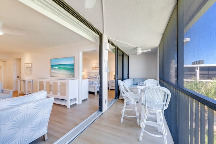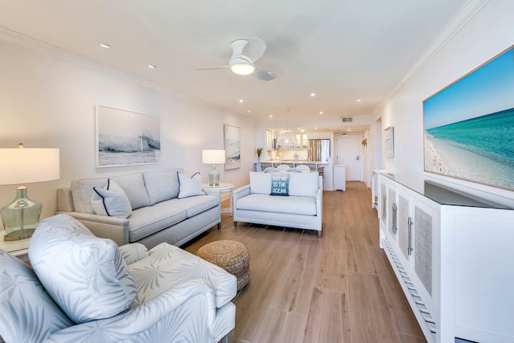СЪВСЕМ НОВО! Насладете се на искряща гледка към залива от това релаксиращо крайбрежно убежище на последния етаж. Този голям апартамент с една спалня разполага с красиво разширена персонализирана кухня, луксозна двойна баня с тоалетна и голяма душ кабина. Най - доброто крайбрежно обзавеждане във всяка стая. Попийте сутрешното слънце или вечеряйте с гостите на големия ланай. Основната спалня предлага изглед към залива, голямо двойно легло с първокласен матрак Stearns и Foster, както и бюро в пълен размер, ако се нуждаете от тихо пространство, за да поработите. Wi - Fi е напълно подобрен, за да направи стрийминг и видео разговори лесни. Гостите имат достъп до 4 плажни стола, 2 плажни чадъра, малък хладилник, играчки за пясък и сушилня за дрехи в помещението.