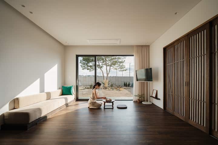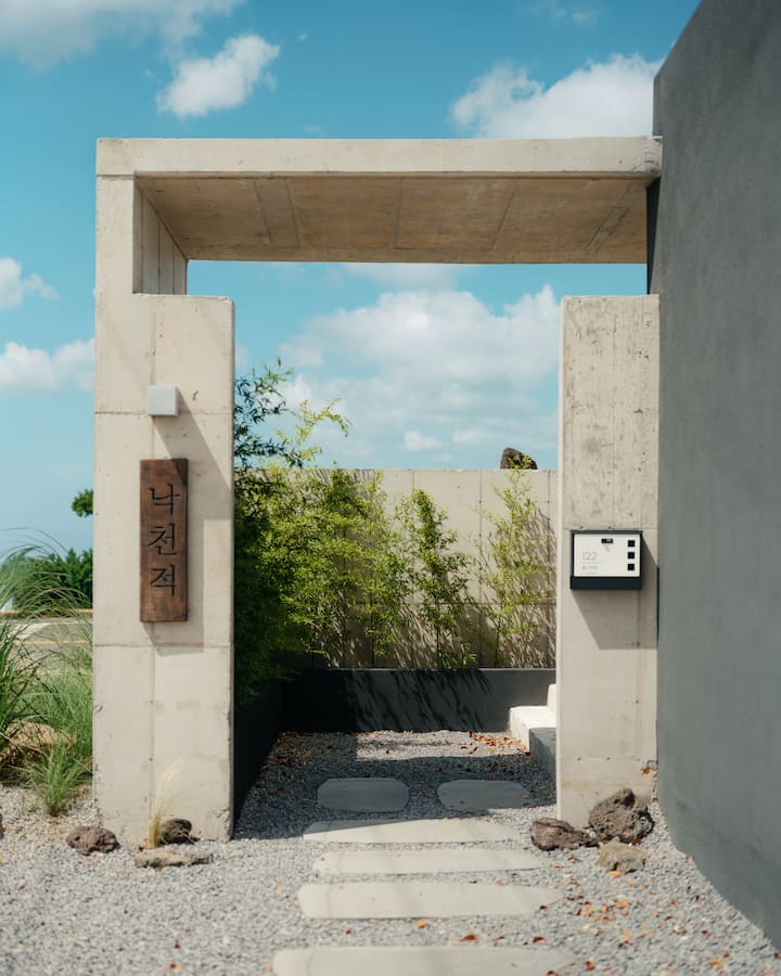 Намира се на уединено и спокойно място в западната част на Чеджу и е частна пенсия, където можем да имаме само ние. Има голяма градина, където можете да усетите четирите сезона, джакузи и пясъчна детска площадка. Има съоръжения за барбекю, на които можете да се насладите само на открито, така че можете да усетите вкуса на пътуването си повече. Това е частна пенсия, където можете да избягате от ежедневието си и да се насладите на нова чувствителност като място за семейства, двойки или само за себе си.