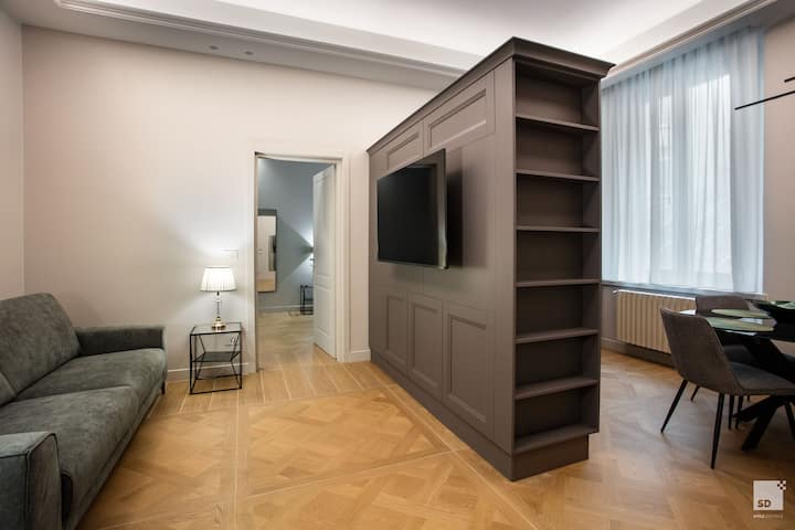 Сърцето на апартамента е светла и добре пропорционална всекидневна с паркет тип „рибена кост“, високи тавани с корнизи и библиотека по поръчка, която елегантно разделя телевизионната зона от трапезарията. Светлината се излива през прозореца с изглед към града. От страната на дивана има и практичен разтегателен диван, който превръща всекидневната във втора спална зона, която може да побере до 4 гости.