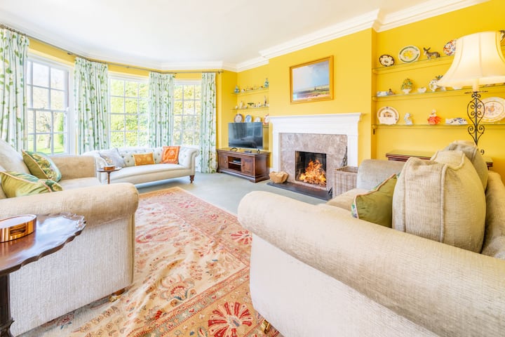 Официална всекидневна с камина, удобни места за сядане за дванадесет гости, с три големи дивана и фотьойл. Смарт телевизор. Изглед към имота през големи георгиански прозорци от двете страни на стаята.