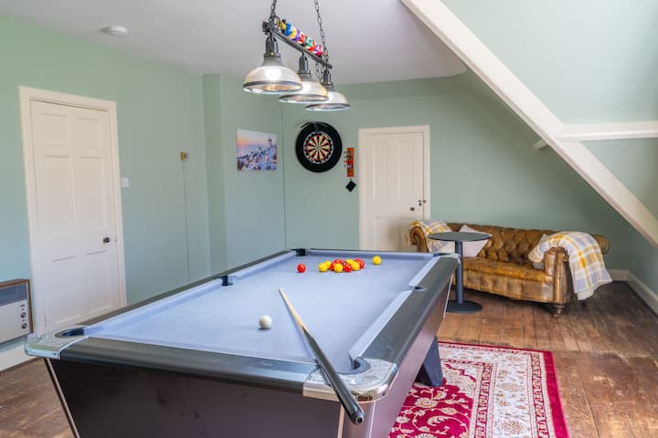 С пълноразмерна билярдна маса, дартс дъска, допълнителни места за сядане.