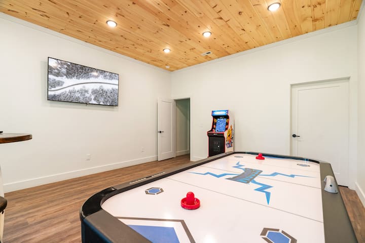Насладете се на южняшкия чар в нашата уютна дървена колиба с просторни жилищни помещения и удобен достъп до местните атракции. Влезте вътре, за да усетите съвременна атмосфера, предназначена за отдих и комфорт. Отворената кухня и всекидневната осигуряват приветливо пространство, независимо дали приготвяте семейна вечеря или се наслаждавате на късна закуска с приятели. И се насладете на семейни игри в зоната за игри.