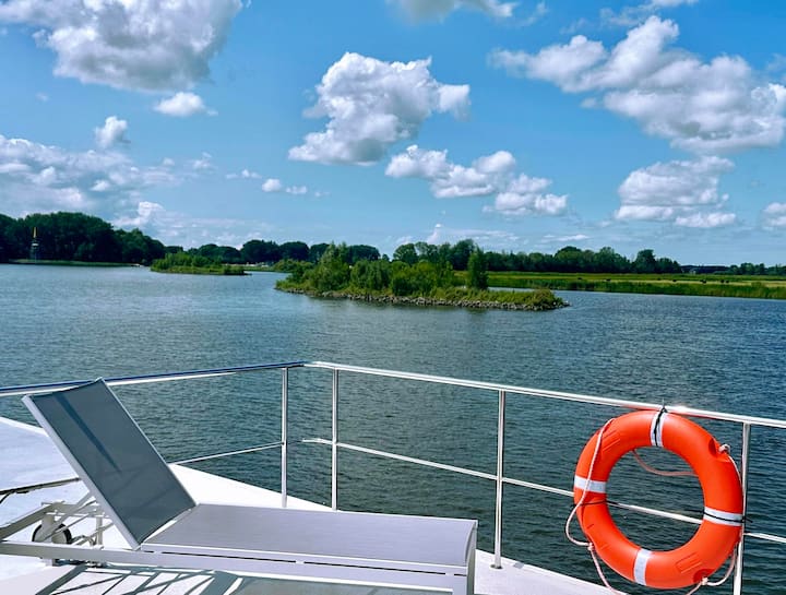 Homeship Blue Sky има подвижността на моторна яхта, комфортът на апартамент с лукса на хотел. Кораб с дължина 15 метра с професионално моторно задвижване, включващо винт с лък и кърма, с който ще плавате от нашия екип. Синьото небе е построено върху напълно собствена визия от собствениците (със страстна визия), направена по поръчка в Нидерландия. С красиви прозорци имате изглед към красивата обстановка на фризийските езера и тераса с шезлонг, която е удобно достъпна отвън. Наистина красиви гледки към Фризийските езера!