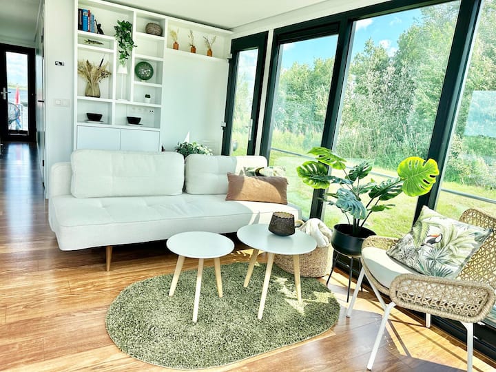 Прекрасно удобно. Влизате в стаята, където и двете спални имат двойно пружинно легло. При пристигане всички легла винаги са добре направени за вас, а пакетът за обслужване на плавателни съдове е готов. Има и просторна отделна тоалетна, баня с душ и мивка. Уютният салон предлага 180 - градусова гледка към красивата обстановка и е оборудван с напълно оборудвана кухня с уютна трапезария. В уютното жилищно пространство има уютен кът за сядане с просторен диван. През стълбите (задната тераса) се изкачвате по просторната тераса на покрива, тук има удобни шезлонги и можете да се насладите на невероятна гледка към Фризийските езера! На предната веранда има друга тераса с удобни шезлонги.