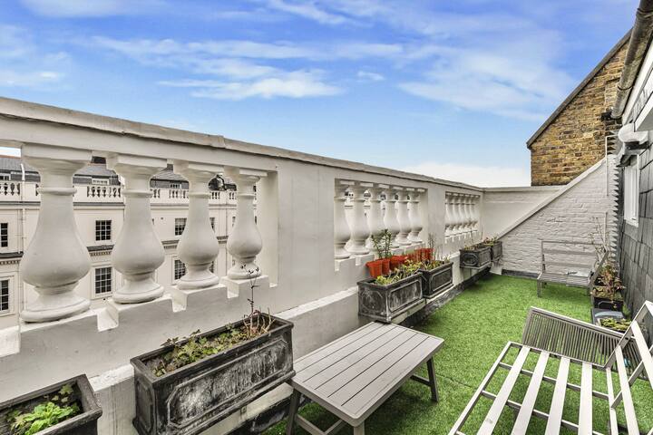 Частната тераса, свързана с втората спалня, предлага рядко срещано уединение на открито в центъра на Лондон – скрито бижу, където можете да се отпуснете на спокойствие, заобиколени от очарованието на историческата Белгравия.