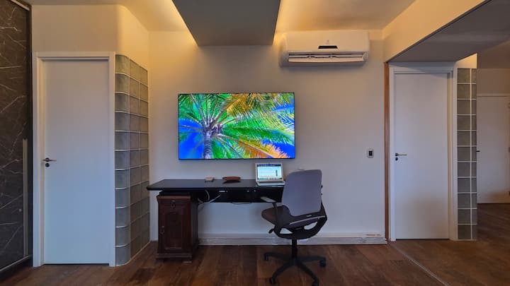 * Интегрирано работно пространство: функционално бюро и ергономичен стол, готови за вашите проекти, с високоскоростен Wi-Fi.