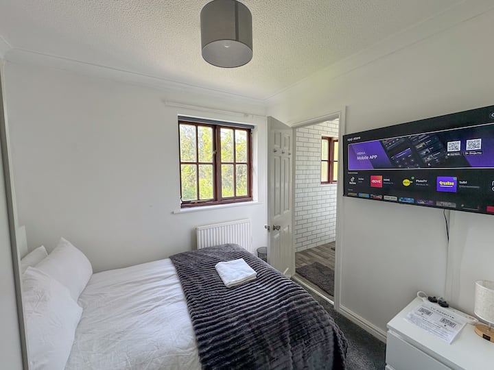 Отделна стая с баня, смарт телевизор, бърз Wi-Fi и паркинг на алеята. Насладете се на обща кухня и голямо трапезария. Идеално за продължителни престои или бизнес.