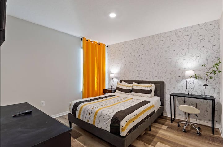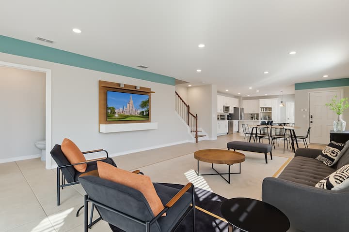 Добре дошли в модерния ви прилепена къща с 3 спални и 2,5 бани в курортна общност само на няколко минути от Дисни. Насладете се на просторна всекидневна с отворен план, напълно оборудвана кухня и отделен вътрешен двор. Удобствата в стил курорт включват басейни, клубна къща и фитнес център. Този дом в тих и безопасен квартал предлага лесен достъп до световноизвестните тематични паркове, търговски центрове и ресторанти в Орландо. Идеално за семейства или групи, които искат да изживеят магията на Флорида с всички удобства на дома.