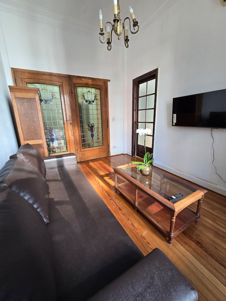 Този просторен и светъл апартамент съчетава очарованието на традиционната архитектура на Буенос Айрес с необходимите удобства за комфортен престой. С високи тавани, оригинални дървени подове и възстановени антични детайли, то предлага топла, елегантна и функционална атмосфера 😁