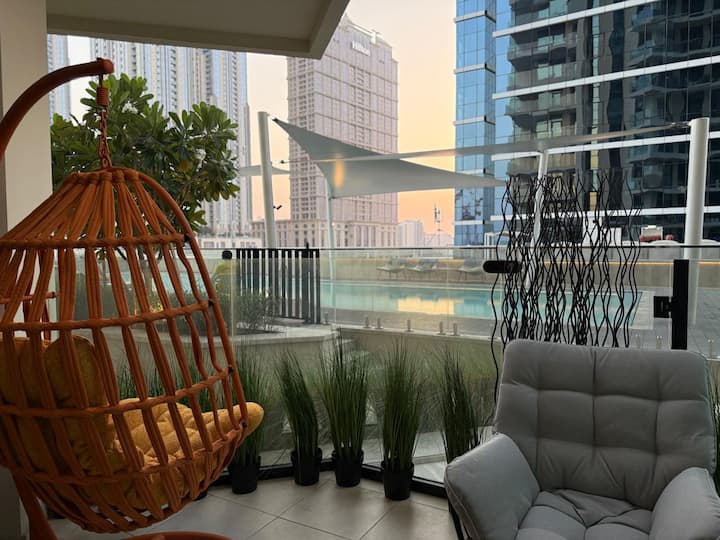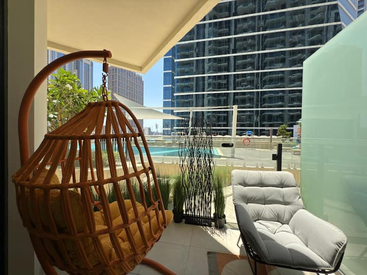 Уютно студио с изглед към басейна на балкона | Бизнес залив
