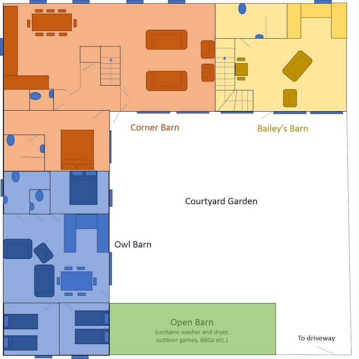 За да зарадваме съседите си, моля, бъдете внимателни с нивата на шума, когато сте навън в двора, особено вечер. Молим групата да влезе в Corner Barn (със затворени прозорци и врата) около 21:00 ч., за да избегне оплаквания от нашите съседи и други гости.