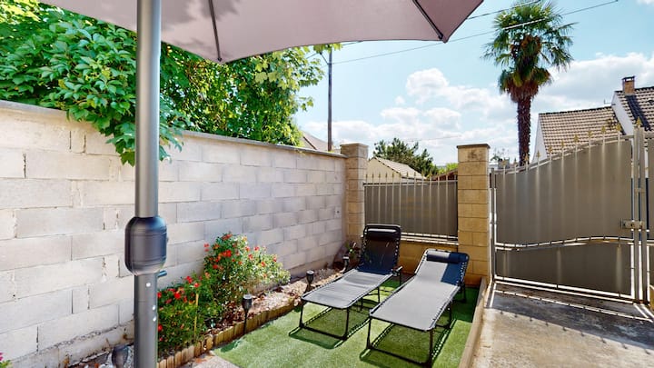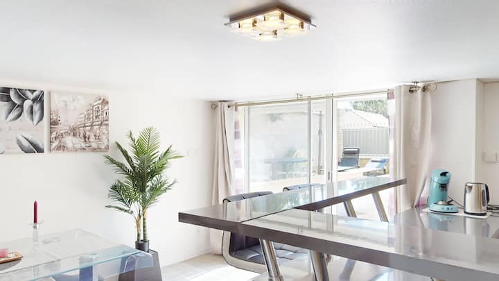 Уютен, напълно оборудван апартамент, декориран с вкус. Уютната всекидневна на Джоселин и Бруно с декоративна камина, модерна кухня с бар и светла трапезария. Идеално за комфортен престой с приятели или семейство. На разположение е частна тераса с шезлонги за вашите моменти на отдих. Независим вход. На 15 минути пеша от гара Осни (линия J до Париж), близо до Сержи и неговите развлекателни дейности: център за отдих, Вексен, пазаруване, кино.