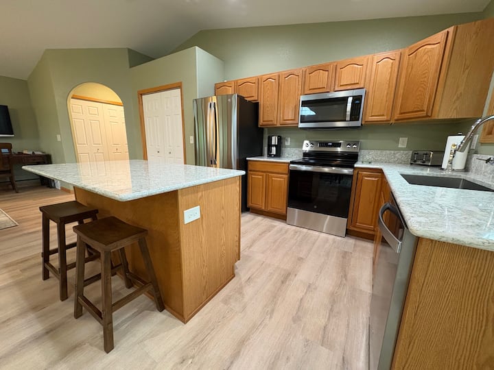 Лесен достъп до атракциите на Блек Хилс (Стърджис, Дедвуд, Хил Сити). Идеално разположен в тих квартал близо до магазини, ресторанти и на минути от центъра на Рапид Сити. Отдихнателно място за почивка, оборудвано с всички удобства на дома. Луксозни винилови подови настилки, килими, прясна боя, всички нови уреди от неръждаема стомана, кварцови плотове, нови мебели, напълно оборудвана кухня, пералня/сушилня, барбекю, Wi-Fi, офис бюро и принтер.