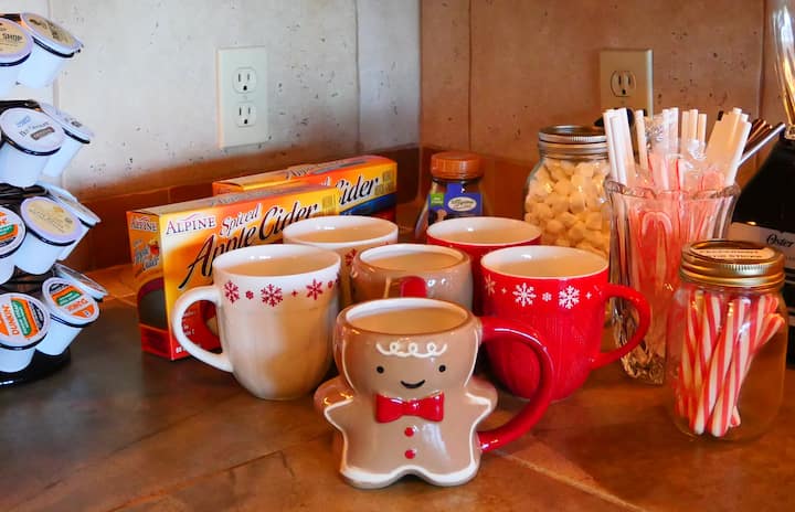 Кухнята е напълно оборудвана, включително (но не само) хладилник с диспенсър за лед, печка/фурна/микровълнова печка, чайник, обикновени чинии, пластмасови чинии (за деца и навън), купи/плато за сервиране, тава за печене, тиган за грил, тенджери (включително голяма тенджера за бульон), блендер, тостер, тенджера под налягане/скоростна тенджера (която може да бъде и бавна готварска печка), фритюрник с горещ въздух, уред за приготвяне на тортили, гофретник, чаши за вино/шампанско/маргарита, отварачка за бутилки/корпус за кафе, чаши за кафе (включително голяма), комплект ножове, основни подправки и др.Станцията за кафе включва неща като смляно кафе, кафе в чаши (безкофеиново, ароматизирано кафе, горещ шоколад, чай и др.), различни видове подсладители, чаши за сметана, мед и др.