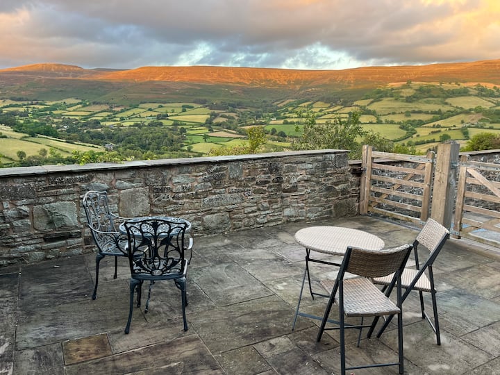 Фермерска къща с прекрасна гледка, високо в хълмовете на Блек Маунтънс в националния парк Банау Бричейниог (Брекон Бийкънс). Насладете се на многото пешеходни и велосипедни маршрути в района или просто се отпуснете в кресло до камината. Къщата за гости Pen Y Caeau Farm е самостоятелна с отделен вход и частна тераса, разположена във фермата ни и прилежаща към основната ферма. Спокойно, но близо до Крикхауъл, Абергавени и Хей он Уай с кола, това е идеалната база за разглеждане или почивка.