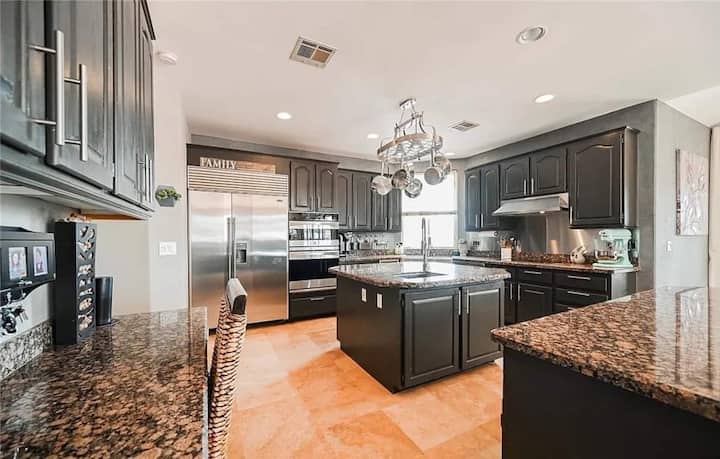 Насладете се на лукса в това имение с 8 спални, 6 бани, 9 легла и невероятни удобства. Предизвикайте приятелите си на частните си игрища за пиклбол и баскетбол, отпуснете се в спа центъра или се отпуснете с игра на билярд. Това просторно, луксозно място за отдих е идеално за семейства, групи или корпоративни престои, търсещи комфорт, забавление и стил – всичко под един покрив. Предназначено за забавления и отдих в пълна уединеност.