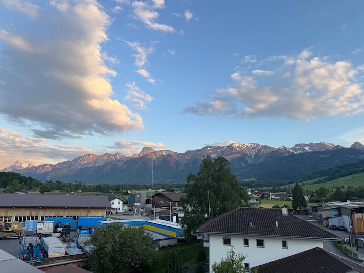 Стая с баня в модерен апартамент с изглед към планината