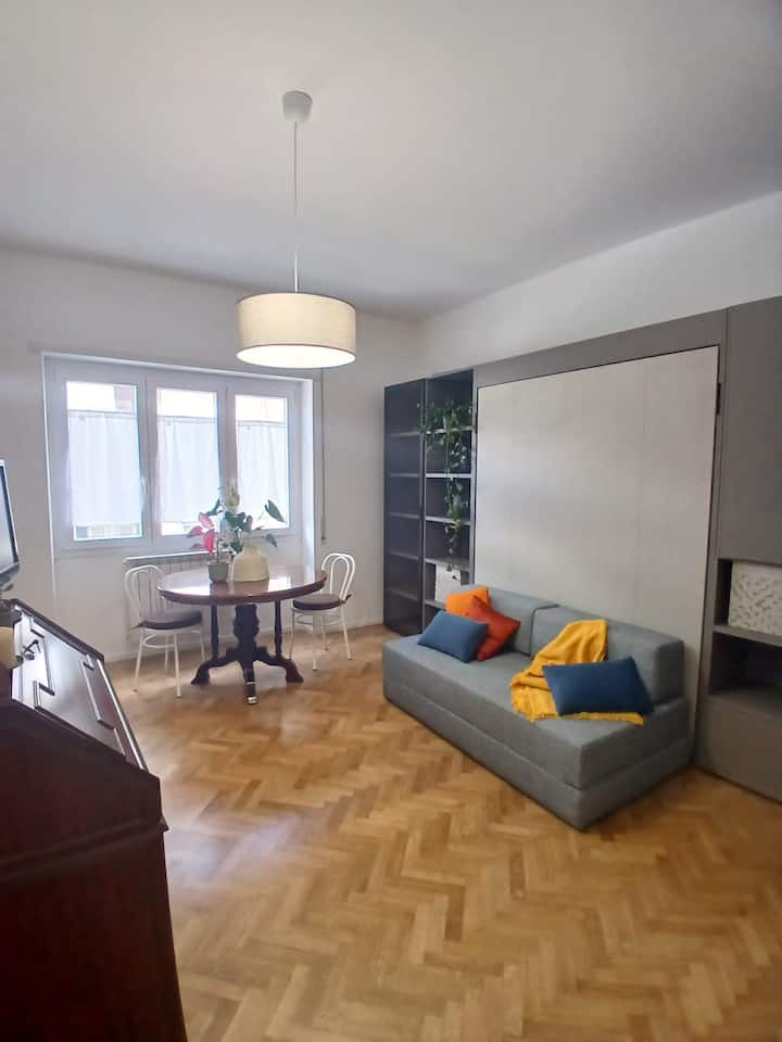Уютно и функционално студио на няколко крачки от Сан Пиетро, идеално за престой от поне месец. Оборудвано с кухня, оборудвана с котлони, пералня, климатик за топъл и студен въздух, модерна баня с душ и прибиращо се легло за оптимизиране на пространството. Голямата маса ви позволява да се храните удобно или да работите. Апартаментът е тих, добре свързан и разположен в обслужван жилищен район, идеален за тези, които идват в Рим за обучение или работа.