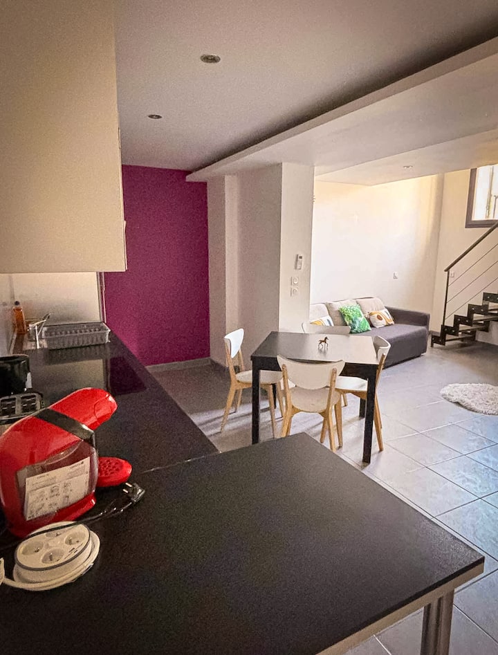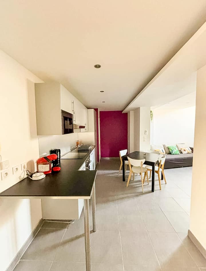 На 20 секунди пеша от плажа, това семейно място за настаняване е близо до всички забележителности и удобства: в сърцето на града, но изненадващо тихо. Помещението е светло и проектирано за вашия комфорт: двойно легло, климатик, телевизор, оборудвана кухня, пералня. Перфектното място, за да се насладите на морето, ресторантите и атмосферата.