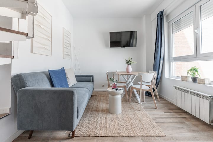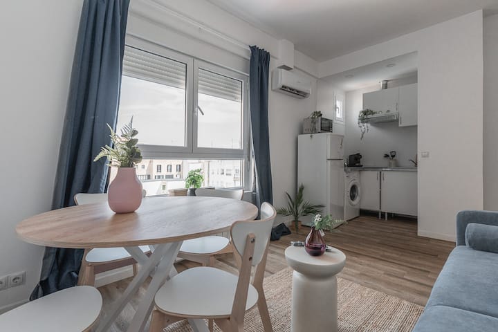 Районът е известен с автентичната си местна атмосфера: очарователни малки кафенета, традиционни тапас барове, квартални пазари и независими бутици ви очакват само на няколко крачки. Апартаментът е с площ около 60 квадратни метра и е проектиран така, че да бъде удобен и практичен. Състои се от всекидневна с вградена кухня, три спални и две бани. Може да побере до пет души, което го прави идеално за семейства и служебни пътувания. Всекидневната, разположена на приземния етаж на апартамента, разполага със смарт телевизор, високоскоростен Wi-Fi и двуместен диван. Кухнята с отворен план има маса за хранене, идеална за наслада на ястия, и е оборудвана с пералня, микровълнова фурна, кафемашина, керамичен котлон, чайник и др. Главната спалня, също разположена на приземния етаж, е обзаведена и има двойно легло (190 x 135 см). Първата баня е отделна и има душ. На горния етаж, до който се стига по спираловидно стълбище, можете да намерите втората спалня с двойно легло (190x135 cm), също обзаведена, и трета спалня с единично легло (190x90 cm). Втората баня също е отделна и има душ. Апартаментът разполага и с ютия, тостер и сешоар. Този апартамент с изглед навън се радва на естествена светлина, разположен е в сграда с асансьор и има всичко необходимо за перфектен престой. Апартаментът включва спално бельо и кърпи. Приятелите ми от MintyStay ще бъдат на разположение през целия ви престой, за да ви помогнат с всичко, от което се нуждаете.
