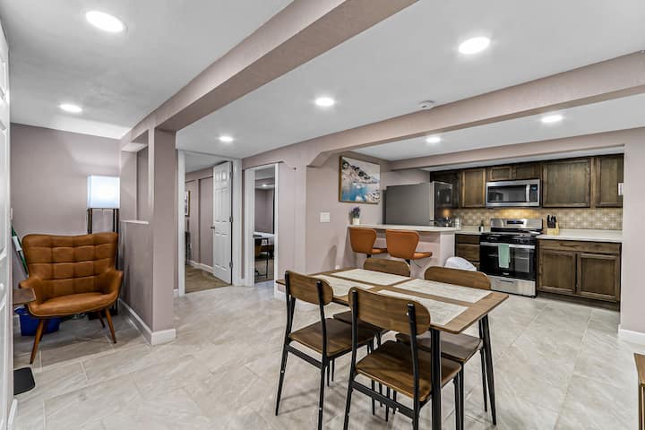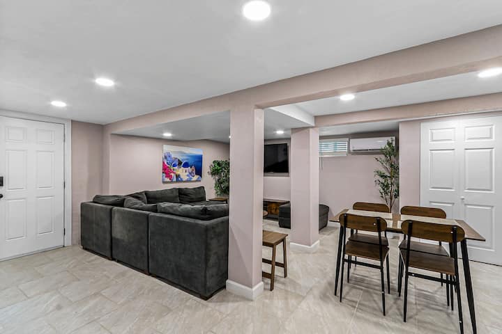 Това „мазе“ с 2 спални и 2 бани предлага идеалния баланс между комфорт и функционалност за семейства, приятели или пътуващи по работа. Влезте в отворено жилищно пространство, оборудвано с голям L - образен диван и 58 - инчов смарт телевизор, идеален за уютни вечери или наваксване с любимите си предавания. Мини сплит система осигурява комфортна атмосфера, независимо от сезона!