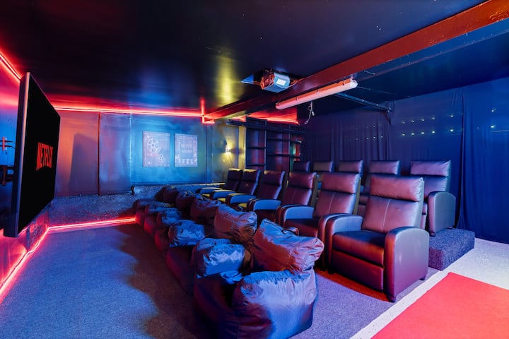 Отличителна характеристика – плюшени места за сядане на няколко нива за над 16 гости, хладилник за напитки, машина за пуканки, 75-инчов смарт телевизор и завладяващ съраунд звук за незабравими филмови вечери.