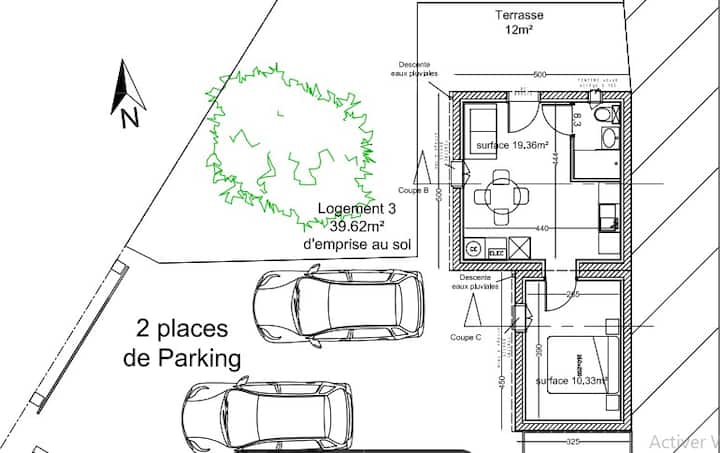 🏡 Климатизиран апартамент от 37 м² със собствена тераса и хубава обща градина с дървета.