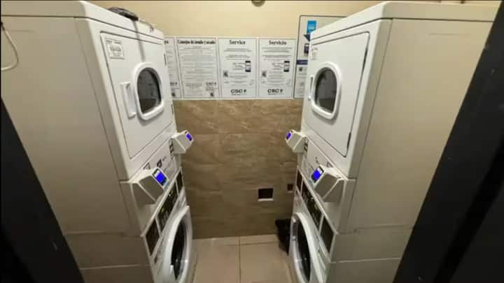 Перални помещения на 3-ия и 2-ия етаж. Излезте от асансьора, следвайте коридора вдясно и потърсете стаята със стъклената врата вляво.
