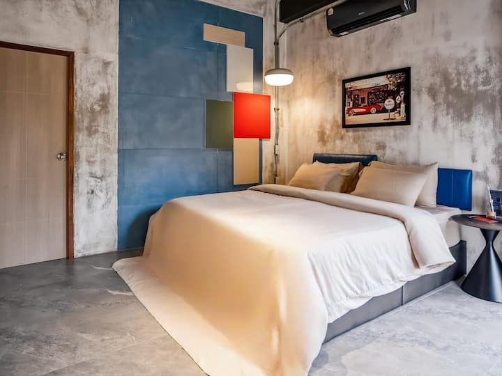 Модерен индустриален лофт: изглед към градината + суперголямо двойно легло