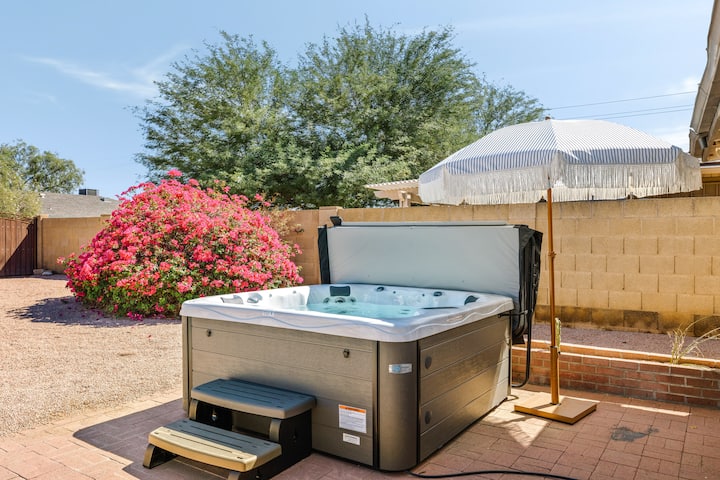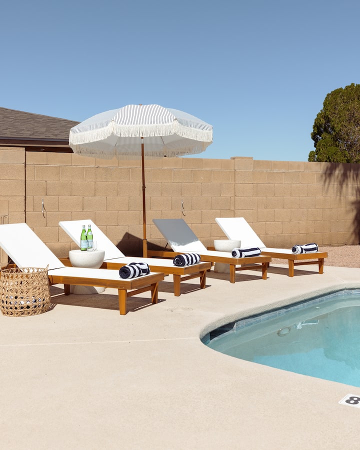 Добре дошли в курорта „Скот Дезърт“, модерен пустинен оазис на няколко минути от центъра на Темпе и университета на щата Аризона. Този новоремонтиран дом с 4 спални съчетава лукса на курорта с релаксирания пустинен живот, като разполага с отопляем басейн, хидромасажна вана, огнище, открита трапезария и люлеещи се палми. Вътре ще откриете елегантен дизайн, пълна стая за игри и стилни детайли – идеално за групови почивки или луксозни почивки в сърцето на Долината на слънцето.