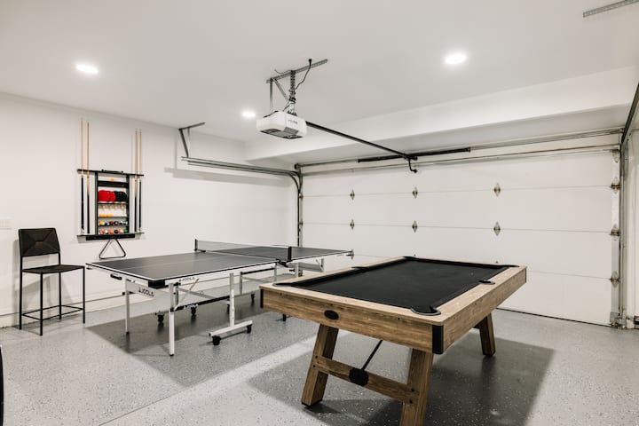 Гаражът е напълно превърнат в стилна стая за игри, в която има маса за билярд и пинг-понг – идеална за вечерни състезания или дневни забавления.