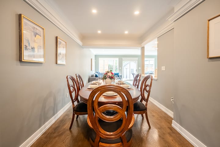 ✦ Добре дошли в този просторен дом с три спални, проектиран за комфорт и удобство.Отпуснете се в светлата всекидневна с уютна секция, камина и голям телевизор или се съберете около елегантната маса за хранене.Гответе с лекота в напълно оборудваната кухня и се насладете на храната на голямата маса за хранене.Отпуснете се в две комфортни спални (едната с двойно легло king size) с луксозно спално бельо, плюс многофункционална спалня в сутерена.Модерните бани, пералнята в дома и обособеното офис пространство го правят идеален за семейства и приятели.