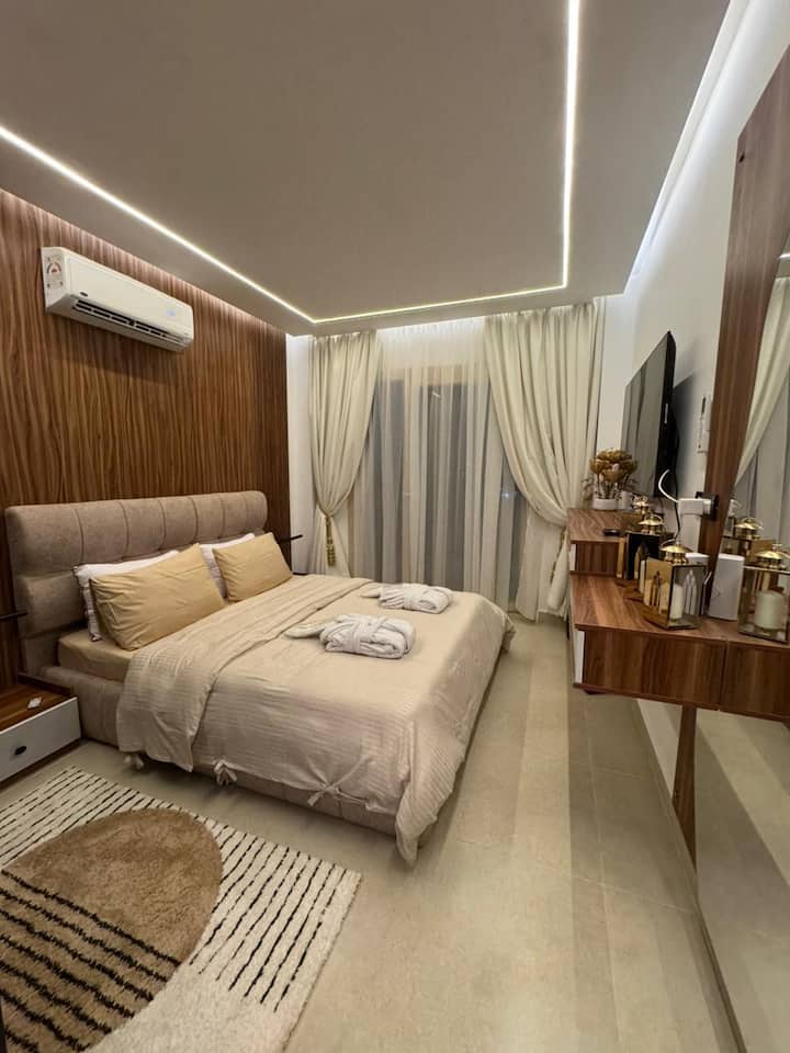 Модерен апартамент с една спалня в красивия залив Набк, Шарм ел Шейх. Насладете се на светла всекидневна, климатик, напълно оборудвана кухня и самостоятелен балкон. Отпуснете се край басейна или разгледайте близките плажове, кафенета и магазини. Перфектно за двойки или самостоятелни пътници, търсещи комфорт, удобство и слънце на Червено море. Включени са Wi-Fi, денонощна охрана и паркинг.