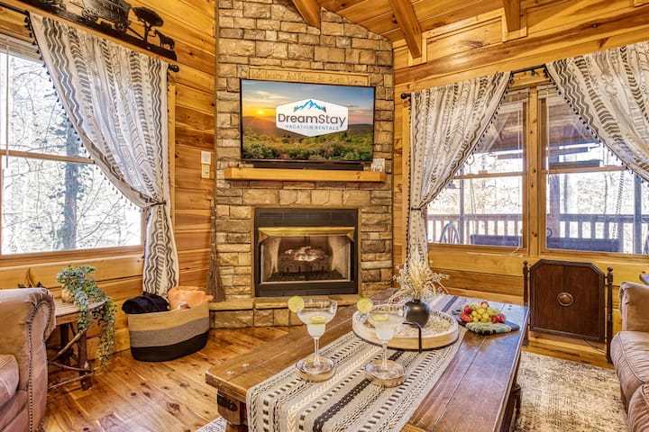 Влезте в топла и гостоприемна дървена колиба, проектирана за комфорт и релаксация. Голямата стая разполага със сводести тавани, газова камина от подредени камъни и уютно обзавеждане, което улеснява отдиха след ден, прекаран в изследване на Смоки планина.
