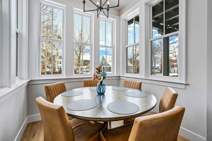 Дневната зона е разположена около газов камина в стил кирпич, акцентиран с цветни мозайечни плочки и вградена пейка. Удобни кожени и тапицирани столове, смарт телевизор и изобилие от естествена светлина създават привлекателно пространство за събиране или отдих след ден на реката. Отвореното оформление се влива безпроблемно в трапезарията и кухнята, а килимите на слоеве и топлите дървесни тонове вдъхват живот на югозападния характер на стаята, отразявайки жизнения стил на квартала Саут Мейн в Буена Виста.