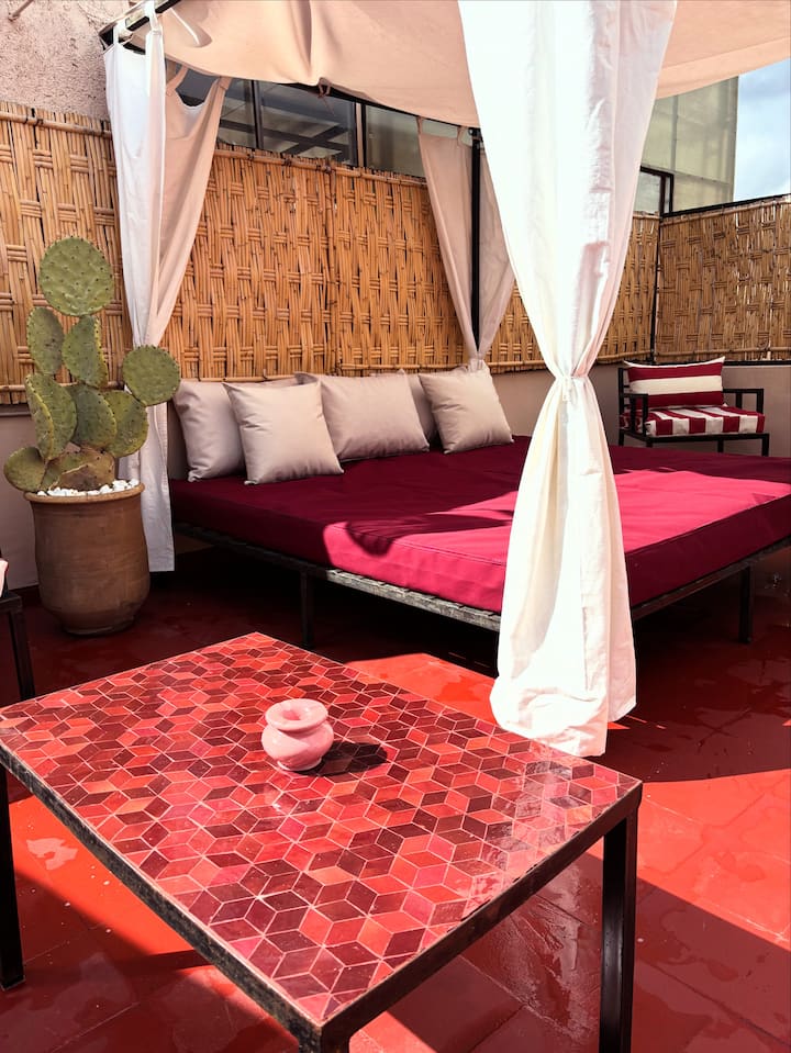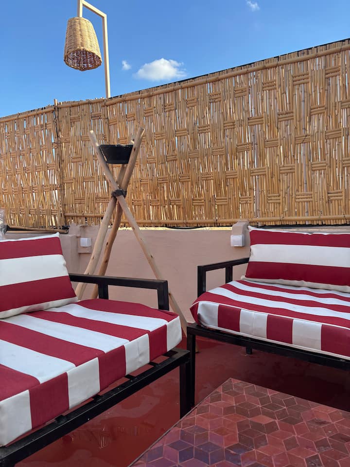 Като се качите още няколко стъпала, ще стигнете до покрива, който ще ви предложи панорамна гледка към медината и планината Атлас. Шезлонг, всекидневна и спална зона ви очакват да се насладите на слънцето и да се срещнете със семейството или приятелите си, оборудвани за вашия комфорт и моменти на релаксация.
