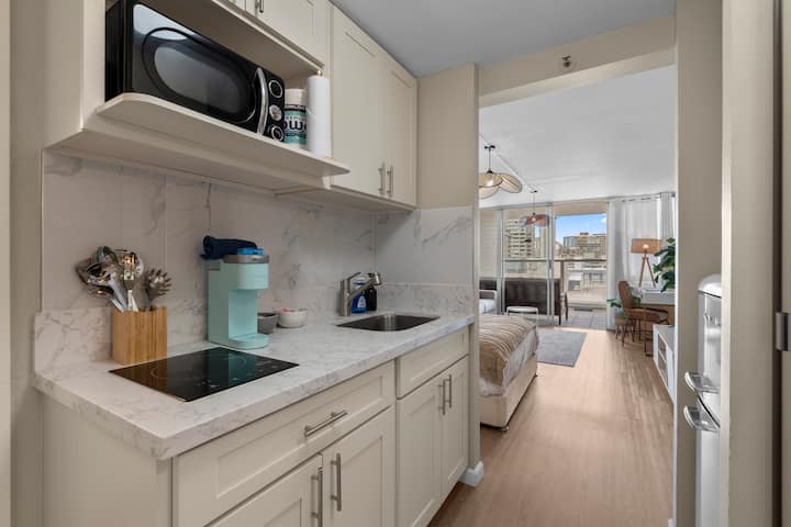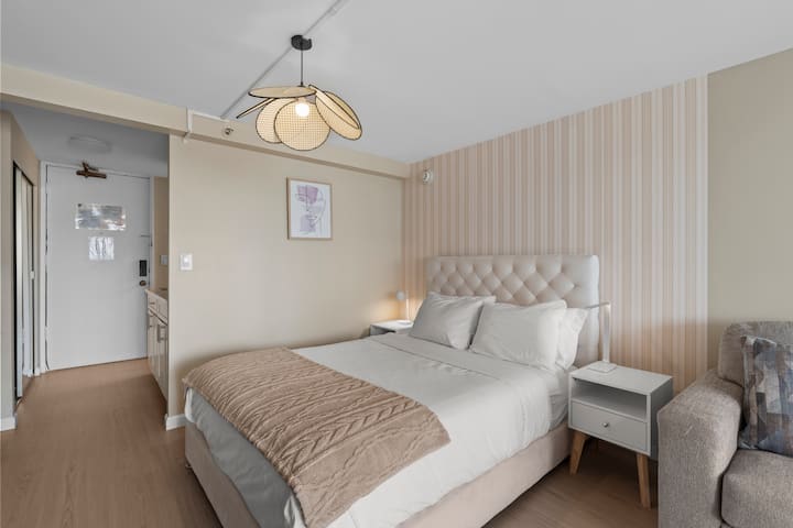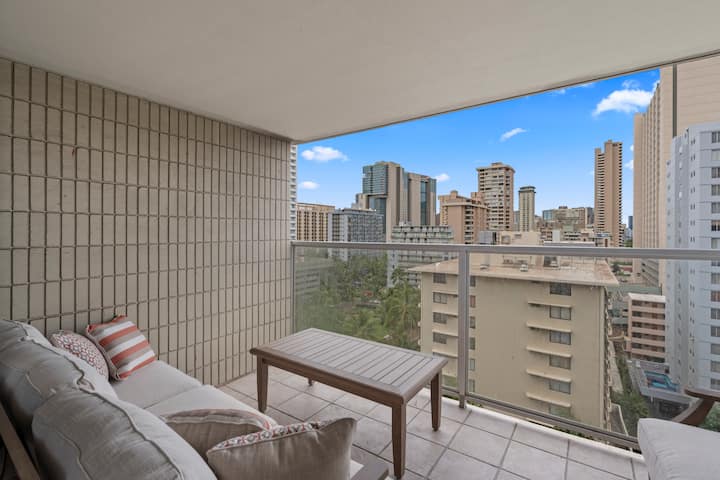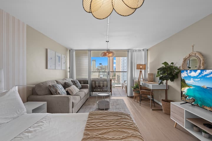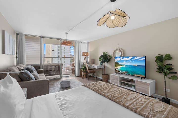 Изпълнено със светлина и с леко бохо настроение, това приветливо студио е предназначено за спокоен живот на острова. С едно двойно легло и удобен разтегателен диван, той е идеален за двойки, приятели или малки семейства. Разположено в сърцето на Уайкики, гостите могат да се разхождат само на няколко минути от плажа, ресторантите и магазините. Насладете се на нежния океански бриз и гледката към канала Ала Уай от частния балкон на 14-ия етаж, както и достъп до басейна и фитнес залата – идеални за отмора след натоварен ден.