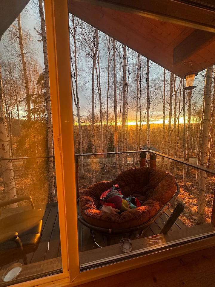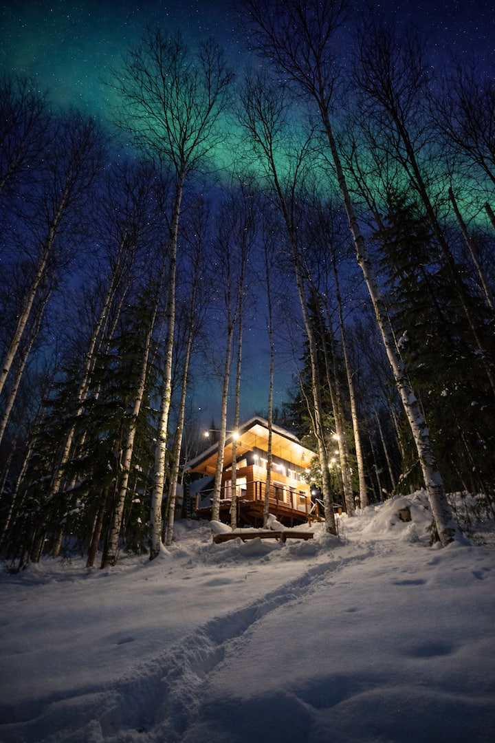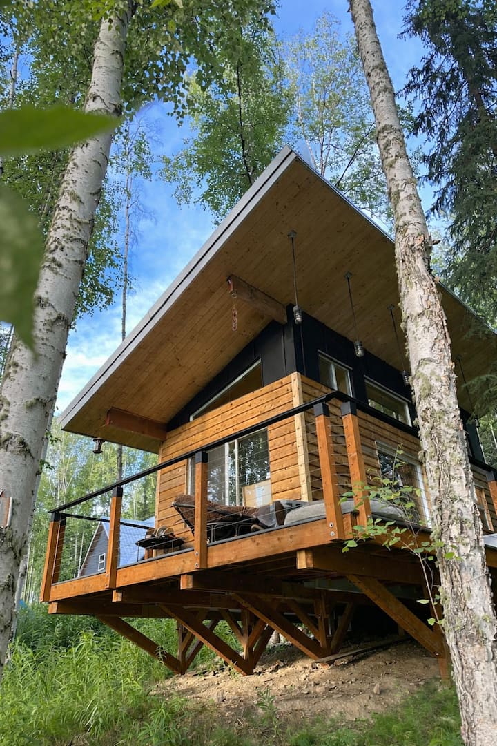 Къща на дърво, вдъхновена от скандинавските традиции, сгушена в тихите хълмове над Феърбанкс. Тази малка къща е умишлено компактна, но внимателно проектирана, с високи тавани, големи прозорци, персонализирани мебели от бреза, пълна кухня и баня и подово отопление. Точно над хребета от градските светлини, от верандата или от поляната на хълма често може да се види полярна светлина. Изискан, ефективен базов лагер за изследване на вътрешността на Аляска.