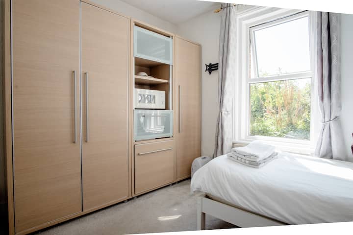 Има тостер за чай/кафе, зърнени храни в стаята заедно с шампоан/балсам и душ гел.