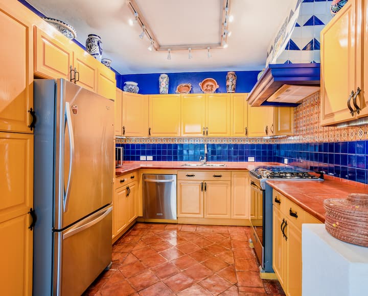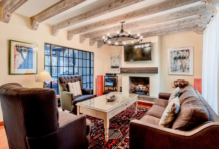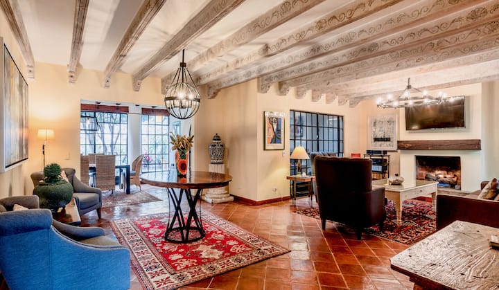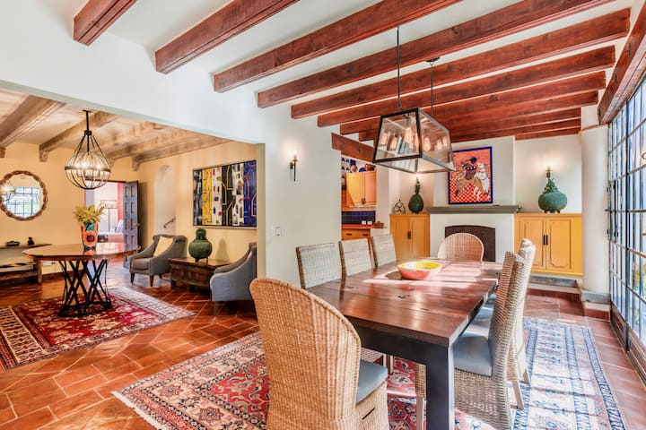 Наскоро реновираната и преустроена къща съчетава мексиканска колониална архитектура с модерен стил и удобство .