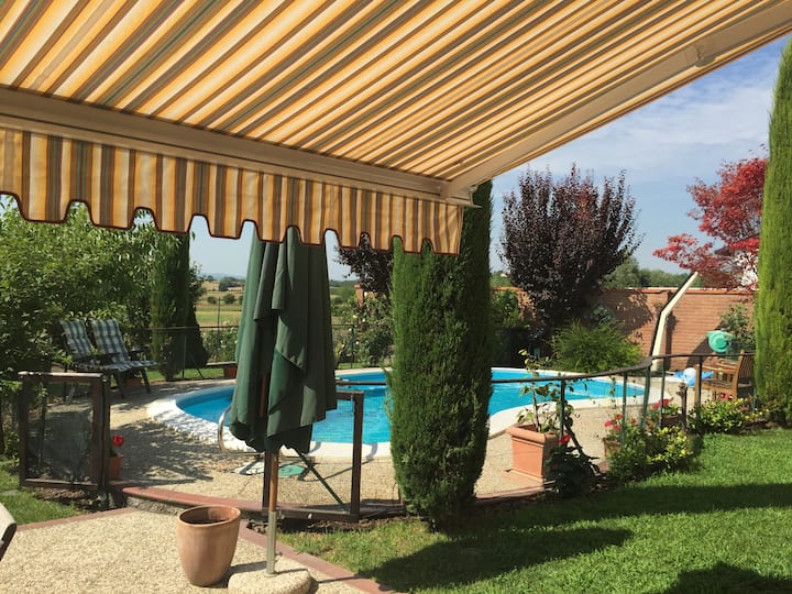 Басейнът е затворен за ваше спокойствие, а електрическата сенна тента осигурява така необходимата сянка през деня и поддържа къщата естествено хладна.