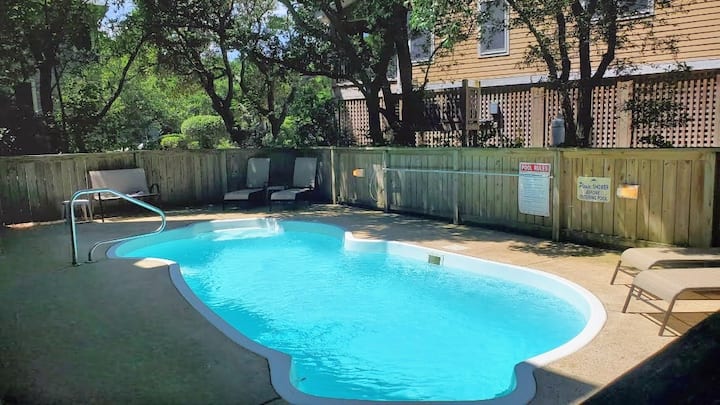 Тераса край басейна: в дома има обширна тераса край басейна с шезлонги, столове, барбекю на газ и лесен достъп до Wi-Fi, за да слушате любимите си плажни мелодии, докато се люлеете и се охлаждате в частния басейн на дома. Дълбочината на басейна варира до около 5 фута. Басейнът е отворен от 1 април до първия уикенд през ноември. Допълнителното отопление на басейна се заплаща срещу такса от 299 USD на седмица или пропорционално въз основа на резервираните дни.