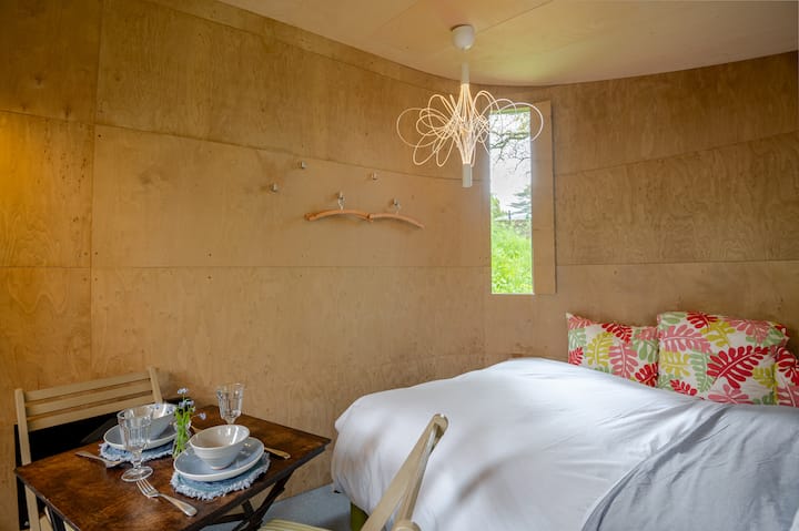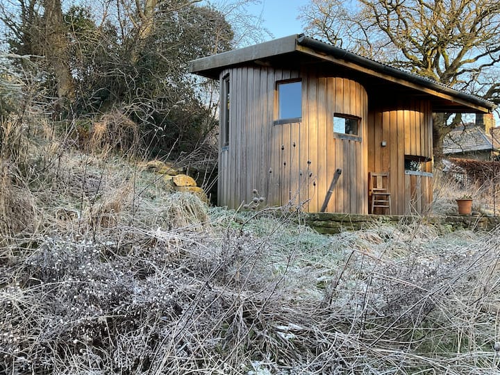 Уютна, извита дървена колиба за глемпинг